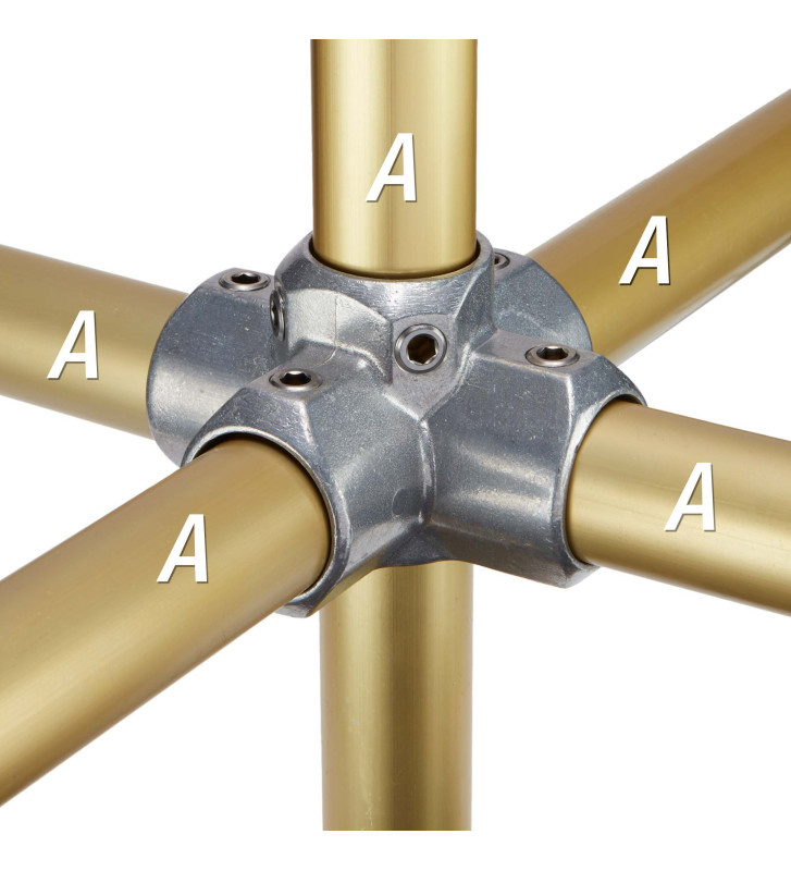 Este conector Kee Klamp es perfecto para construir estructuras con múltiples montantes. Se utiliza comúnmente en proyectos como barandillas, andamios y marcos donde un montante central debe unirse con componentes horizontales en cuatro direcciones.